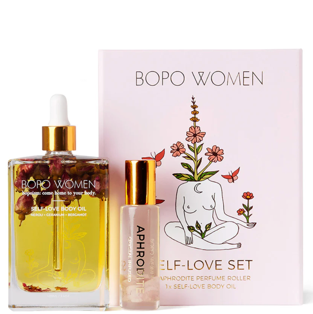 This gift set arrives in a beautiful gift box and features our Self-Love Body Oil and our Aphrodite Crystal Infused Essential Oil Roller. Self-Love Body Oil: combines geranium, bergamot, mandarin & neroli essential oils to infuse your skin with vitamins, fatty acids and antioxidants. It is suited to all skin types, is fast absorbing and can also be used in the bath and on hair ends. Aphrodite Crystal Infused Oil Roller: a crystal infused essential oil blend to cultivate love & abundance in your life. Perfect as a light natural perfume alternative. Combines the heavenly ylang ylang with grapefruit oil, sweet orange oil, patchouli and mandarin oil to create a feminine blend fit for a goddess. Features a Rose Quartz rollerball.