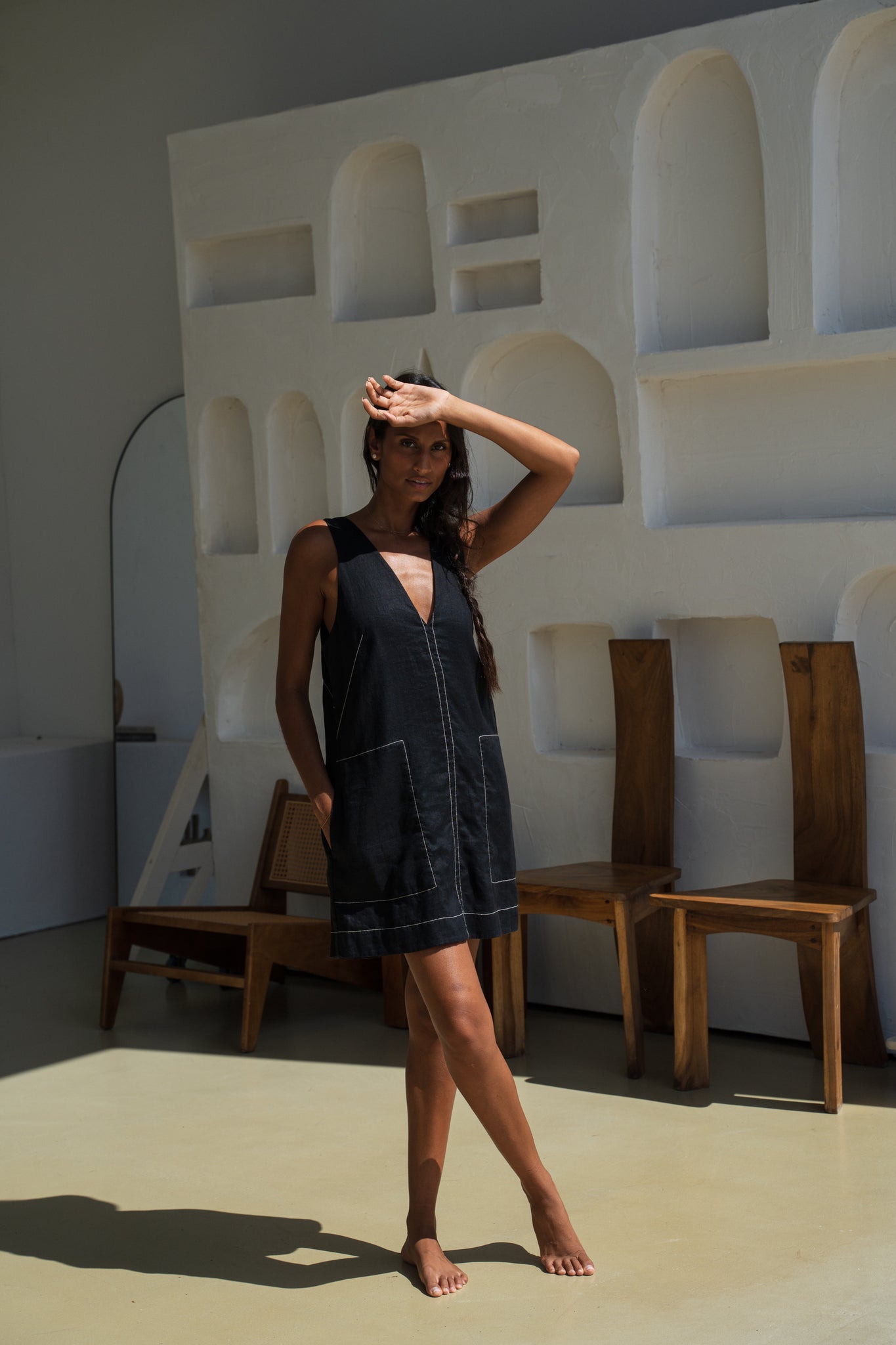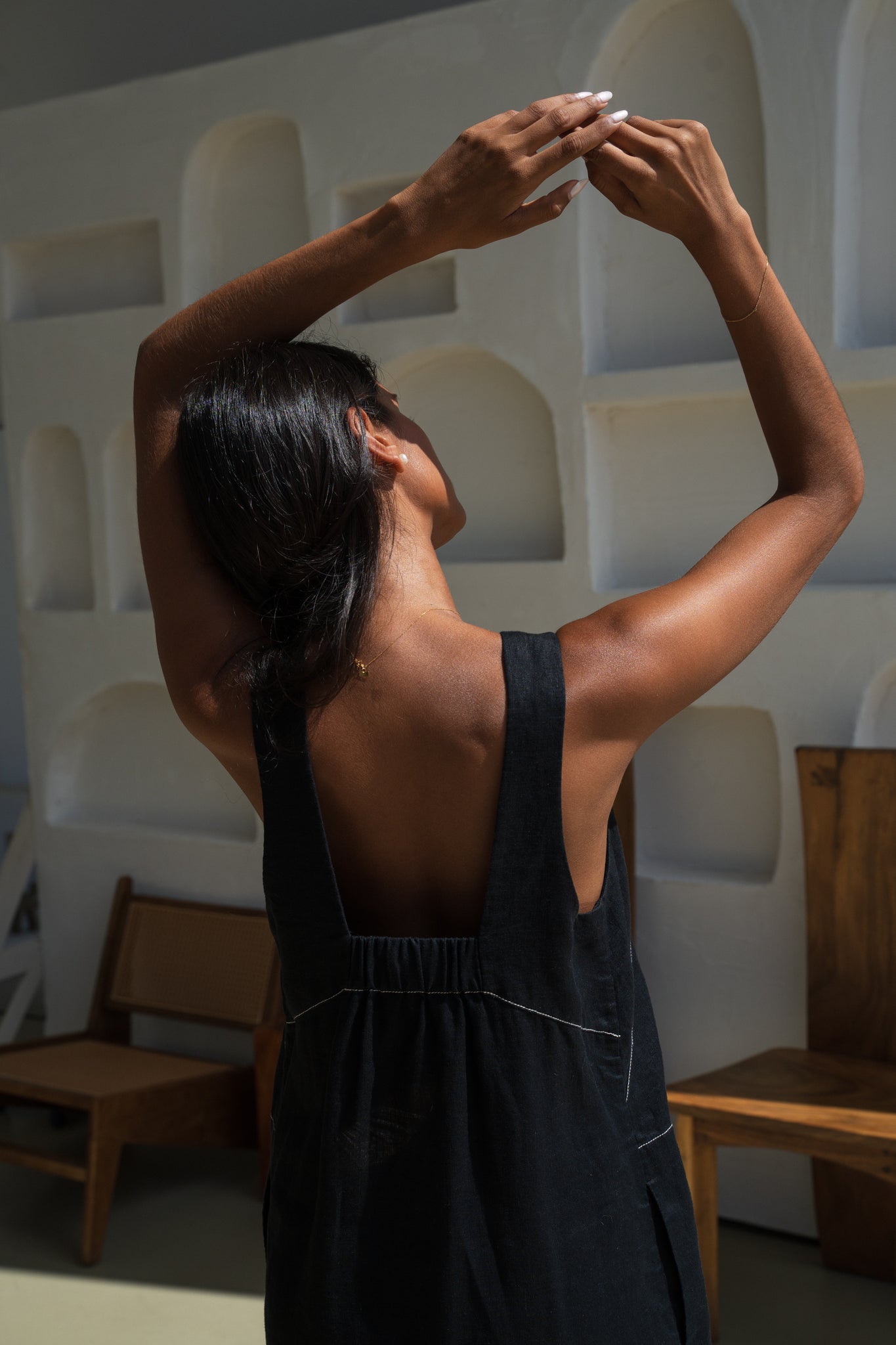 The Isla Linen Dress in Black offers timeless elegance crafted from breathable linen, making it perfect for day-to-night wear. Its classic silhouette ensures a flattering fit, while the rich black hue adds sophistication for any occasion. Effortlessly transition from casual daytime outings to refined evening events with this versatile wardrobe staple.
