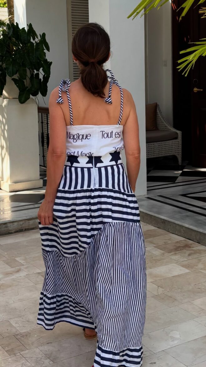 A modern linen cami with Parisian flair. The Tia features a chic bias cut with candy-stripe straps, bringing playful French styling to a versatile summer piece.