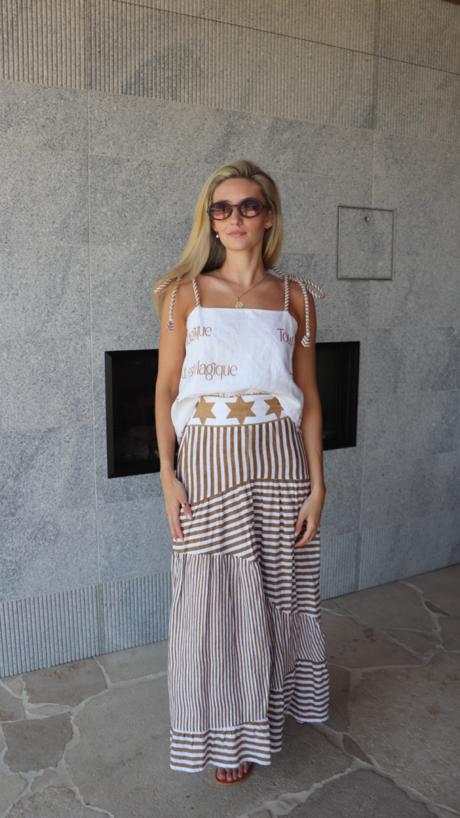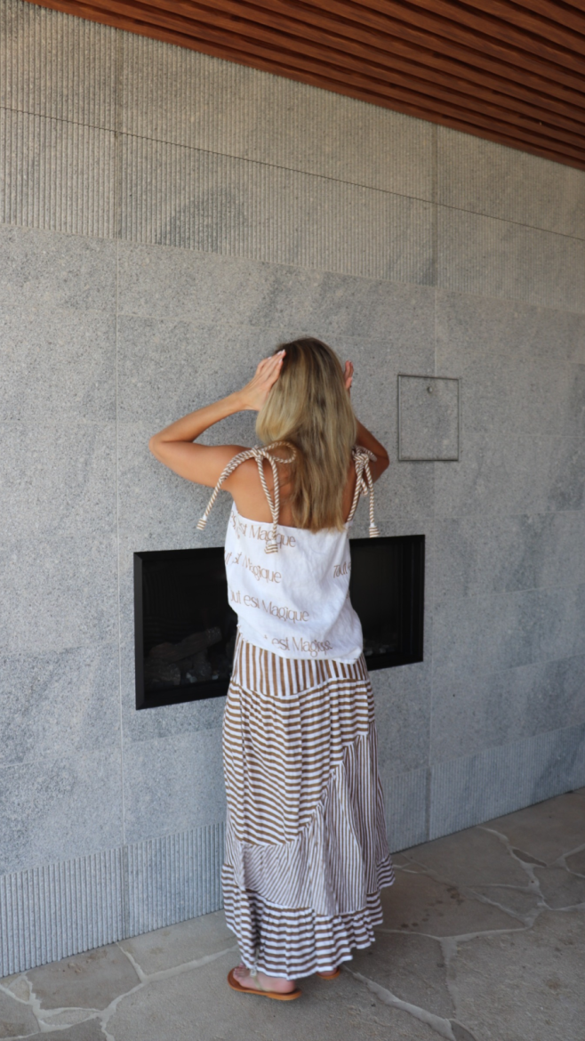 A modern linen cami with Parisian flair. The Tia features a chic bias cut with candy-stripe straps, bringing playful French styling to a versatile summer piece.